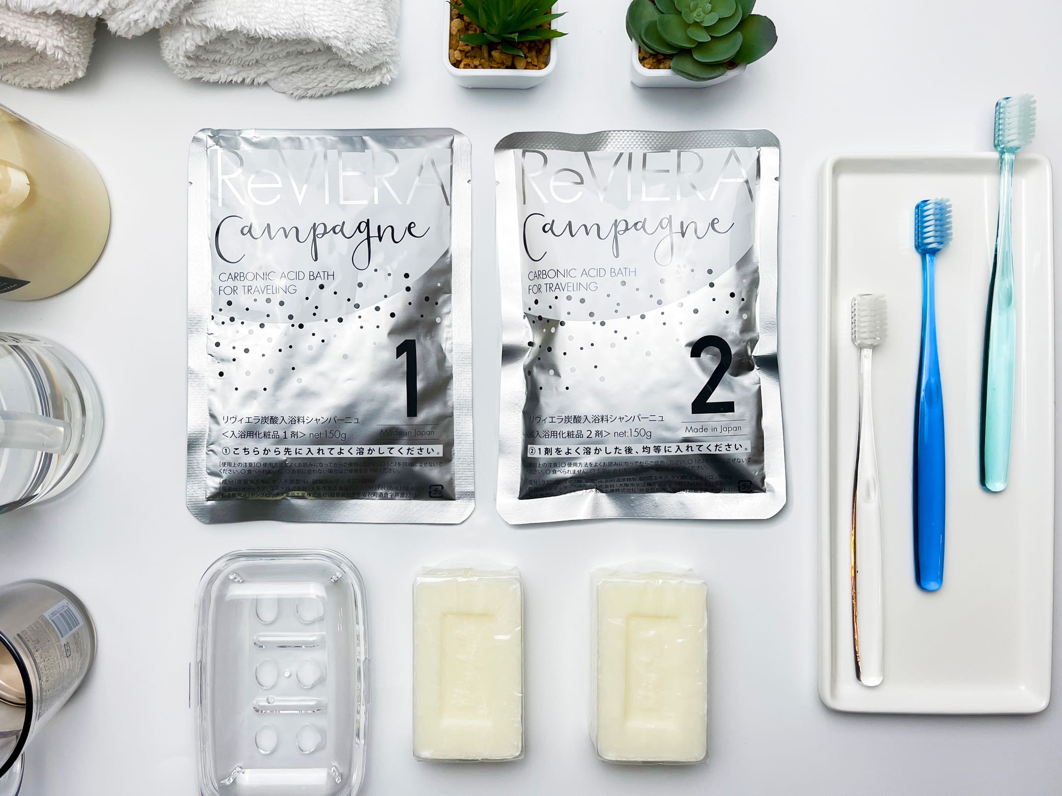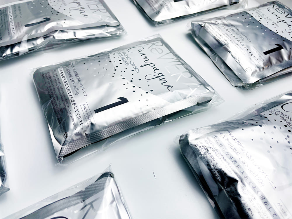 リヴィエラシャンパーニュは、ご旅行先でも気軽に炭酸風呂がお楽しみいただける入浴剤です。
